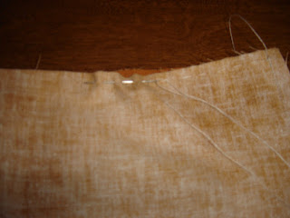 While the fabric is wrong side out sew a running/gathering stitch around one edge, 1/4 inch in. Pull tight to form a circular closing on the bottom. Then sew through the gathered portion multiple times to ensure that it remains closed.